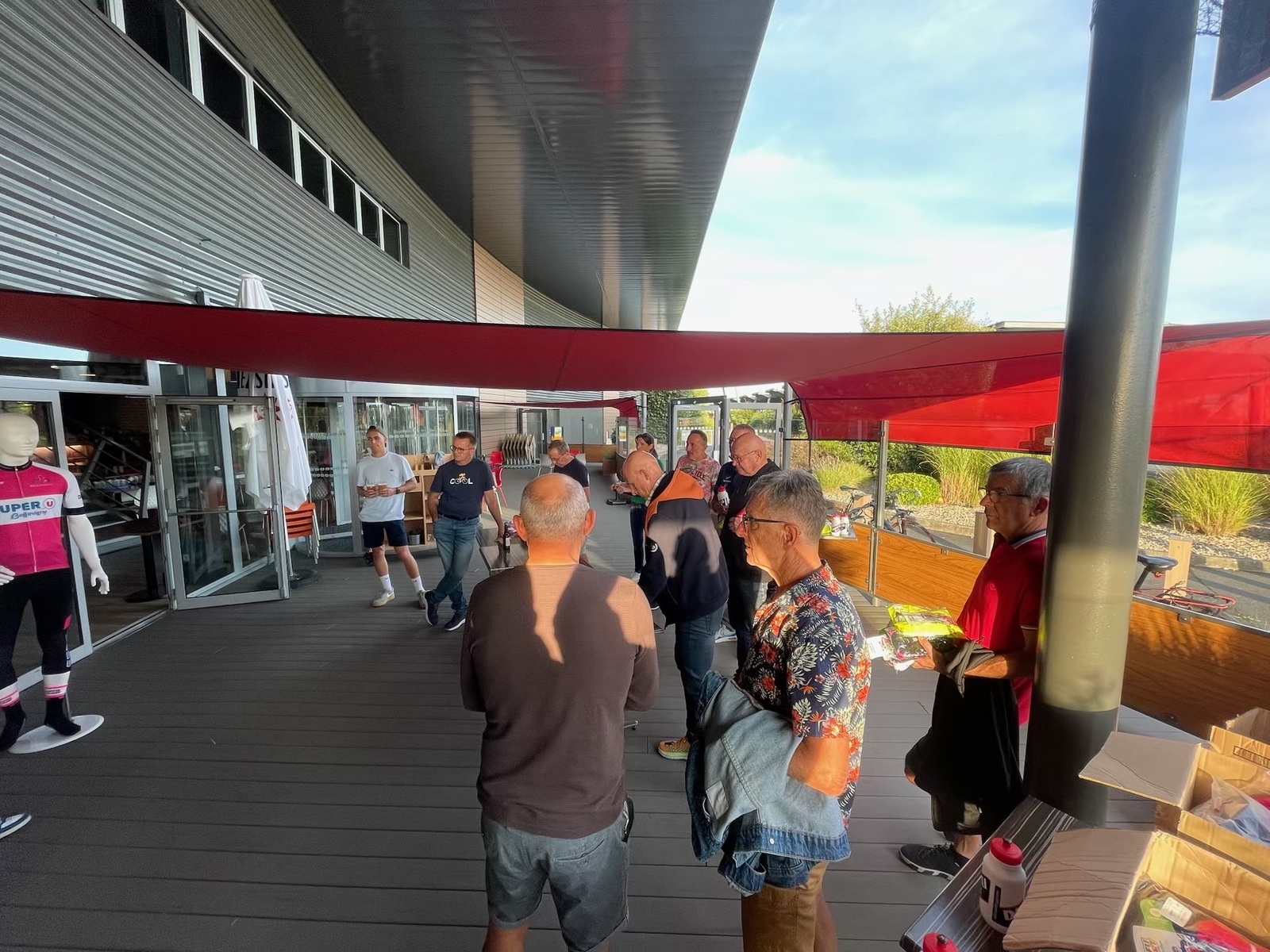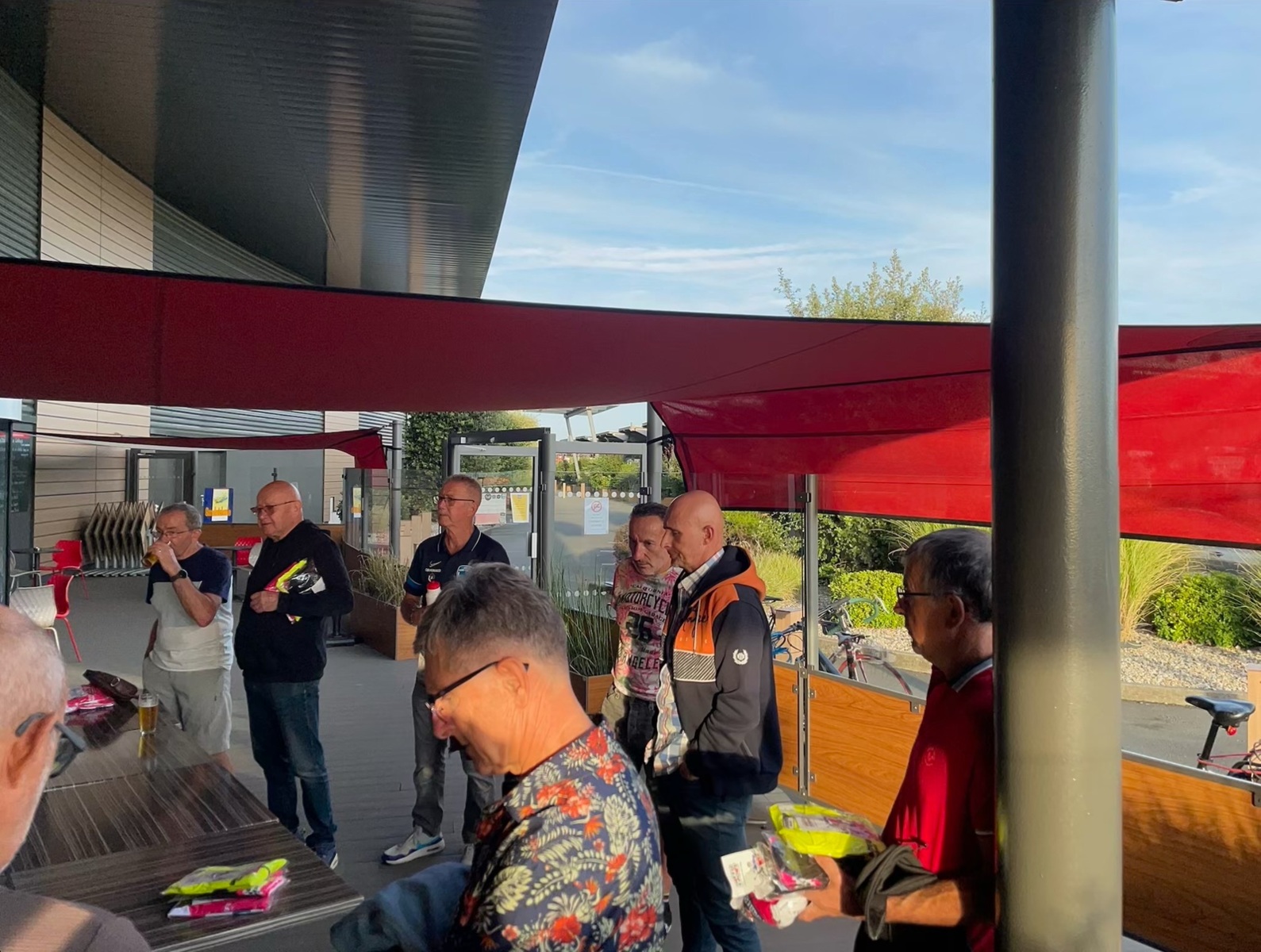 Super moment de convivialité avec les adhérents du clubs venus chercher leurs tenues. Remise du gilet jaune offert grâce à la rando et aux partenaires. Apéro suivi d'un buffet de pizzas offert par le club au restaurant Il Pimento !